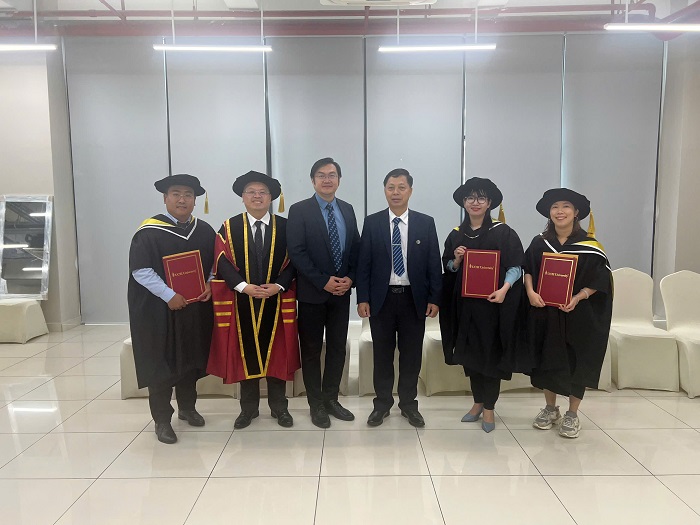 Lãnh đạo UFM, lãnh đạo UCSI chụp ảnh lưu niệm cùng các Tân Tiến sĩ (DBA) thuộc chương trình liên kết giữa UFM và UCSI
