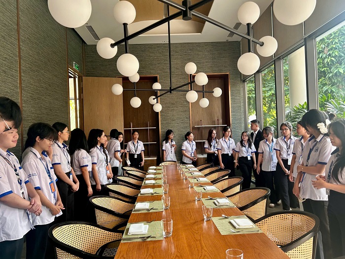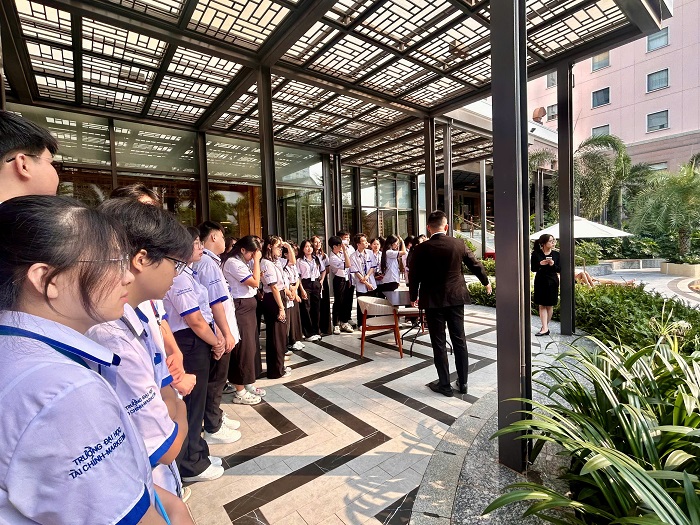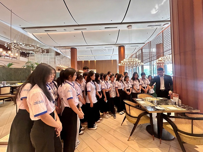 Tiếp nối chương trình, phần Hotel Tour mang đến góc nhìn trực quan về mô hình vận hành tại khách sạn. Sinh viên được giới thiệu tổng thể về quy trình dịch vụ và cách phối hợp liên bộ phận trong môi trường tiêu chuẩn cao. Việc quan sát trực tiếp không gian làm việc, tác phong phục vụ và một số điểm chạm quan trọng trong trải nghiệm khách hàng giúp người học kết nối kiến thức trên giảng đường với thực tiễn vận hành, qua đó hình thành tư duy nghề nghiệp rõ ràng hơn. Nhiều sinh viên cho biết hoạt động tham quan giúp các em nhận diện cụ thể các yêu cầu kỹ năng, chuẩn bị tốt hơn cho giai đoạn thực tập và định hướng vị trí nghề nghiệp phù hợp năng lực.