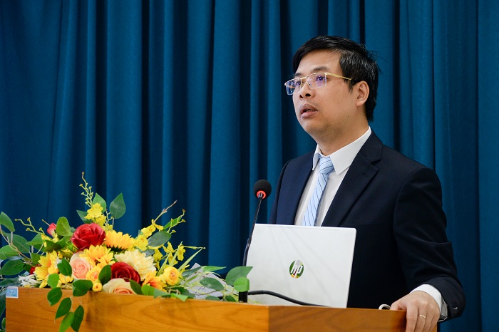 TS. Đoàn Ngọc Phúc, Trưởng khoa Kinh tế - Luật trình bày tham luận tại Hội thảo