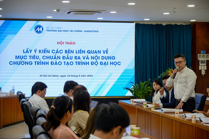 Sáng ngày 10/5/2024, Trường Đại học Tài chính – Marketing (UFM) đã tổ chức hội thảo lấy ý kiến các bên liên quan về mục tiêu chuẩn đầu ra và nội dung chương trình đào tạo trình độ đại học. Chủ trì Hội thảo là GS.TS Trần Thọ Đạt, GS.TS Nguyễn Thị Cành và PGS.TS Phạm Tiến Đạt.