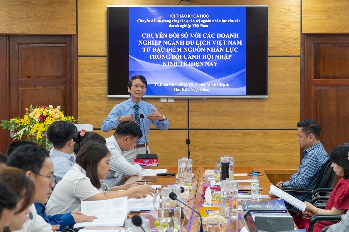 TS. Đinh Kiệm trình bày Tham luận “Chuyển đổi số với các doanh nghiệp ngành du lịch Việt Nam từ đặc điểm nguồn nhân lực trong bối cảnh hội nhập kinh tế hiện nay”