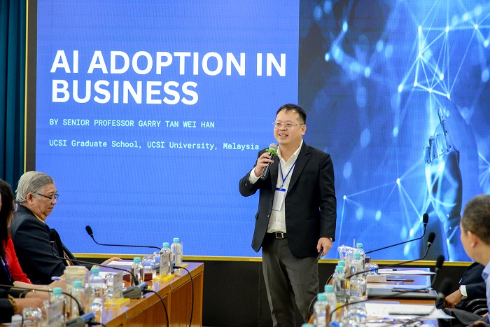 Tại phiên toàn thể, Giáo sư Garry Tan Wei Han (UCSI University) trình bày tại Hội thảo với chủ đề “AI adoption in business: what’s happening and what’s next?”