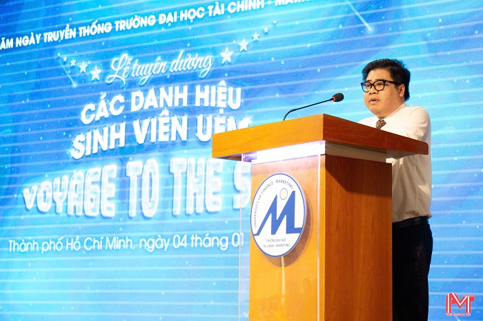 Đ/c Nguyễn Tiến Khôi, Bí thư Đoàn trường tổng kết đánh giá những thành tích xuất sắc mà tuổi trẻ UFM đã đạt được trong 6 tháng cuối năm 2025