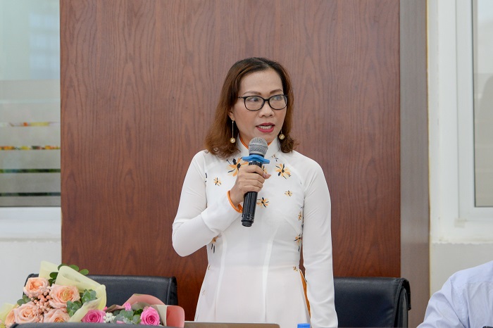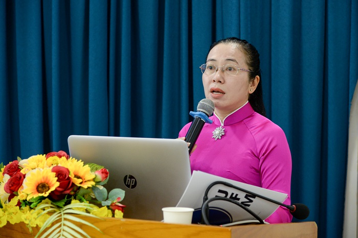 PGS.TS. Phan Thị Hằng Nga, Trưởng phòng QLKH báo cáo Tổng kết hoạt động khoa học công nghệ năm 2023 và triển khai phương hướng năm 2024
