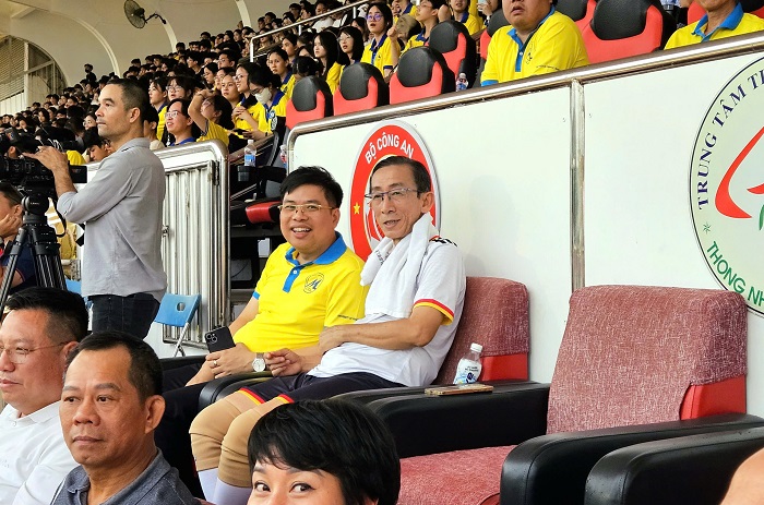 PGS.TS Phạm Tiến Đạt, Hiệu trưởng Nhà trường chụp hình cùng PGS.TS Trần Hoàng Ngân, Nguyên Hiệu trưởng Nhà trường, Đội trưởng đội cán bộ công chức TP.HCM, cầu thủ ghi bàn thắng đầu tiên của trận đấu.