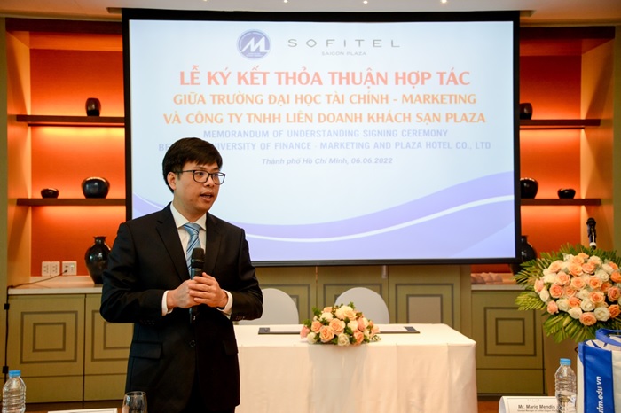 PGS.TS Phạm Tiến Đạt, Hiệu trưởng UFM cũng gửi lời cảm ơn trân trọng đến Công ty TNHH liên doanh khách sạn Plaza nói chung và Khách sạn Sofitel Saigon Plaza nói riêng, hi vọng các nội dung hợp tác nhanh chóng được triển khai trong thời gian sắp tới. Đồng thời, thầy Hiệu trưởng cũng nhấn mạnh, với hơn 45 năm hình thành và phát triển, UFM đã đạt được nhiều thành tựu đáng tự hào, là địa chỉ đào tạo tin cậy, là sự lựa chọn hàng đầu của người học trên các lĩnh vực kinh tế, tài chính, marketing, du lịch…Hằng năm cung cấp ra thị trường lao động hằng nghìn nhân lực chất lượng cao, chuẩn kỹ năng, giỏi nghiệp vụ.