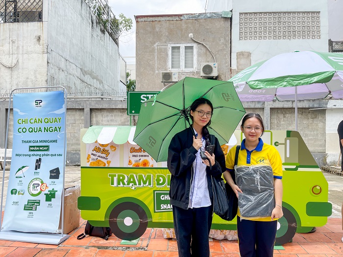 Không chỉ dừng lại ở những chia sẻ trong hội trường, chương trình còn mang đến một trải nghiệm thực tế đầy màu sắc và hương vị. Song song với workshop, School Tour "TRẠM ĐIỀU VUI - STP FOOD SNACK STATION" đã mang các sản phẩm nông sản Việt đến gần hơn với sinh viên. Các bạn đã được thưởng thức miễn phí những dòng snack healthy làm từ 100% nông sản Việt Nam như hạt điều, chuối sấy, mít sấy… được sản xuất theo quy trình xanh, sạch, không chất bảo quản. Không khí trở nên náo nhiệt hơn bao giờ hết với hoạt động Vòng quay may mắn, nơi các bạn sinh viên tham gia minigame và có cơ hội 100% trúng những phần quà độc đáo, thiết thực từ STP Food.